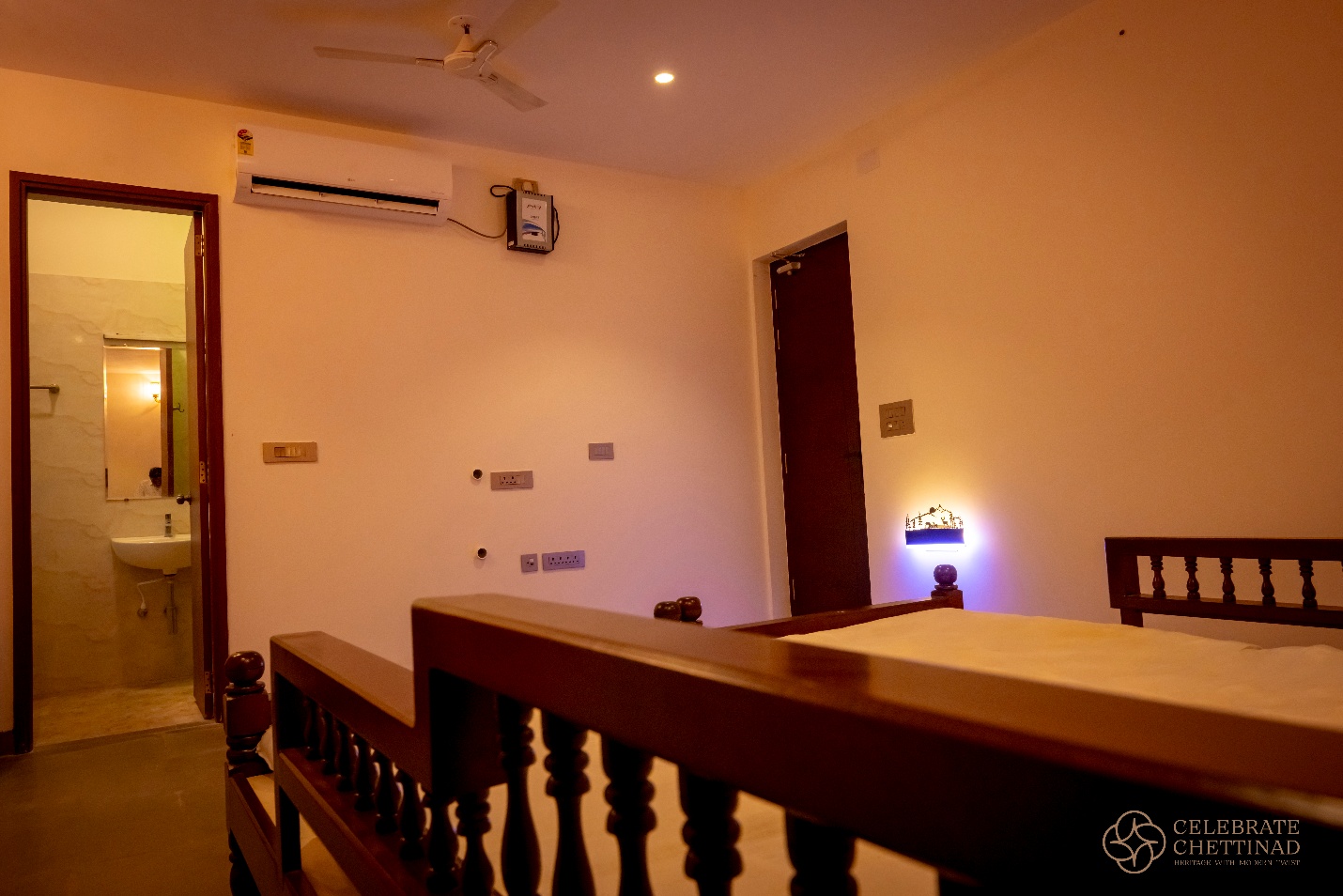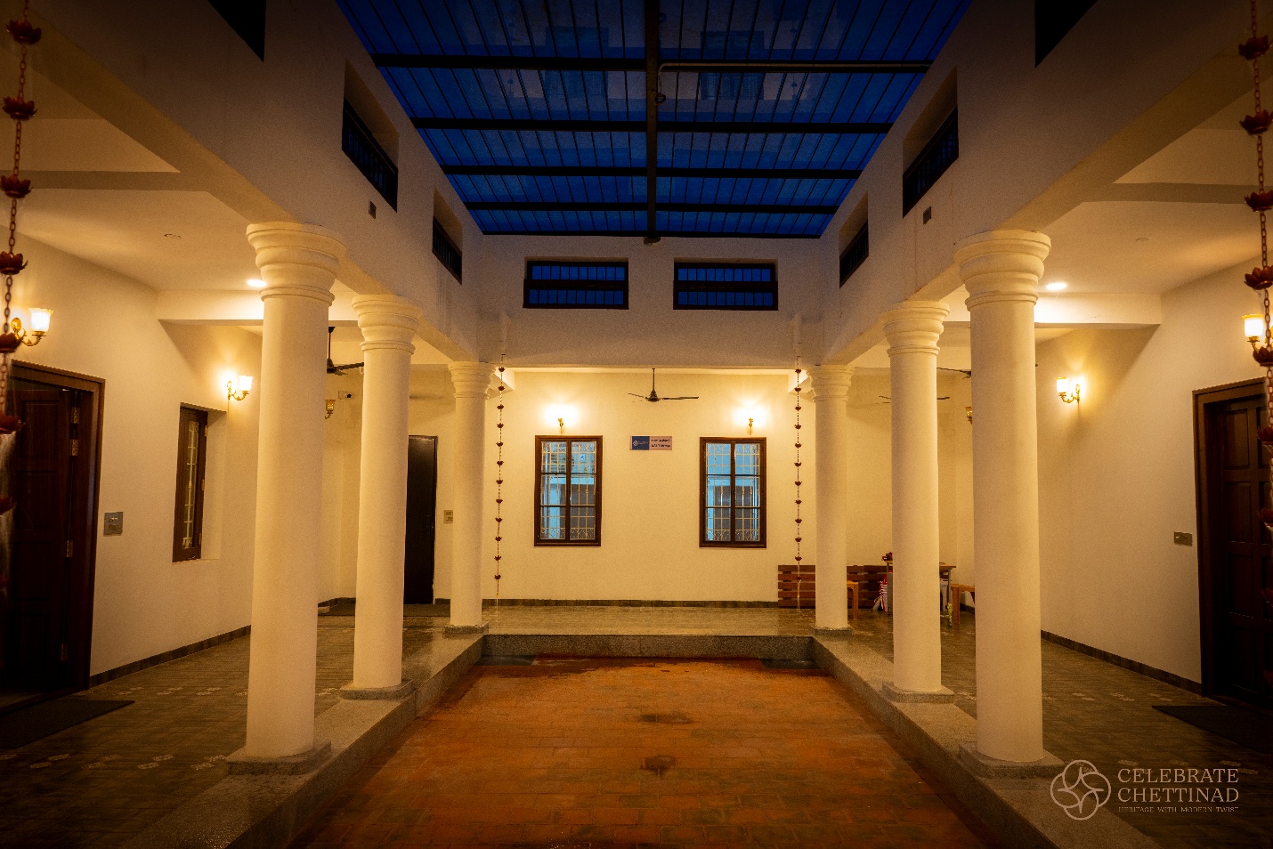 Nagu Courtyard seamlessly blends timeless Chettinad architecture with contemporary comforts, creating an enchanting space for intimate celebrations. This modern courtyard features a fully covered roof that bathes the area in natural sunlight, while ingenious ventilation near the ceiling invites fresh breezes and keeps the atmosphere airy, yet effectively blocks dust and debris for a pristine environment. Ingeniously designed rainwater chains channel rainfall to the corners.